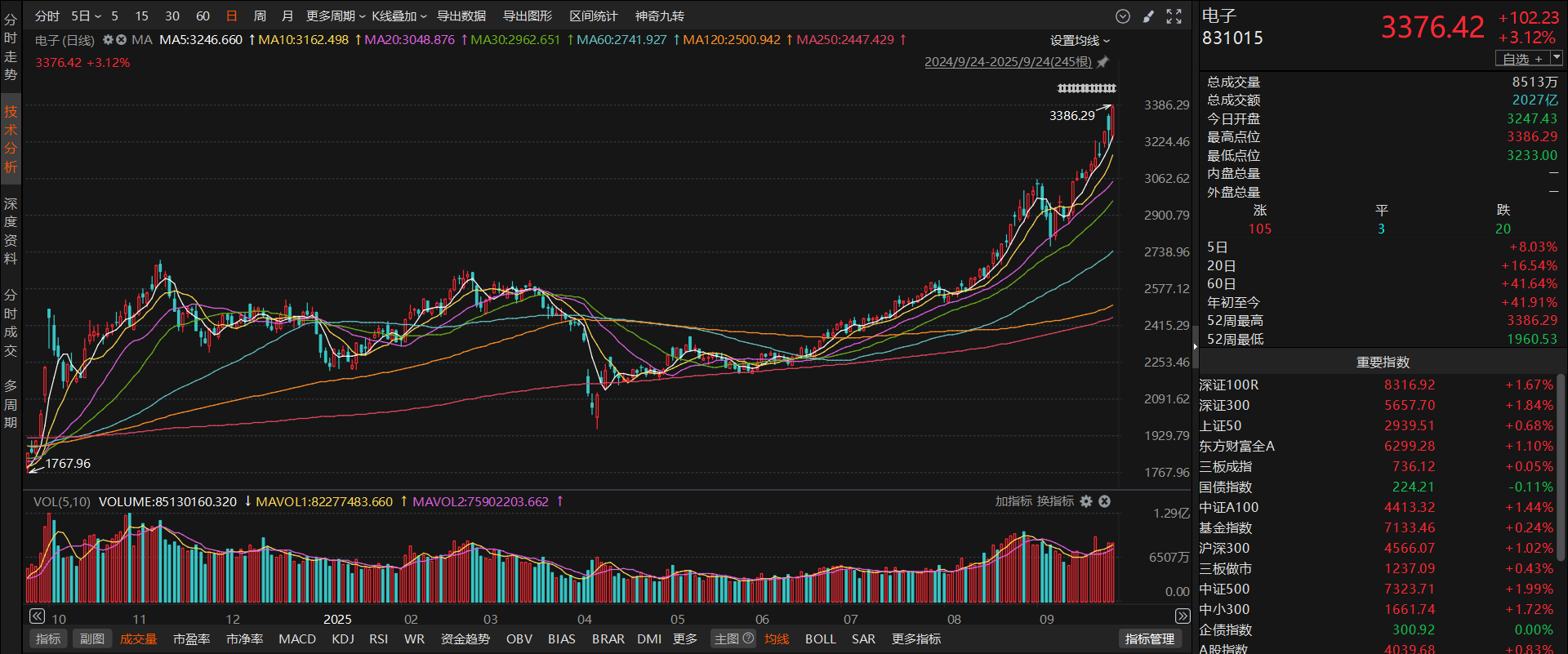 自2024年9月24日三部门“组合拳”出台以来,A股市场迎来近十年来少见的年度强势行情。彼时被称作“924行情”的拐点,在政策托底与资金回流的共同作用下,点燃了投资者的风险偏好。过去一年,上证指数自“924行情”当日的2863点起步,最高一度突破3900点,区间涨幅超过36%配资吧,成为行情最直观的注脚。与此同时,北证50、科创50、创业板指等成长风格指数表现更为突出,全市场翻倍股数量超过1400只,成为资本市场的现象级样本。
